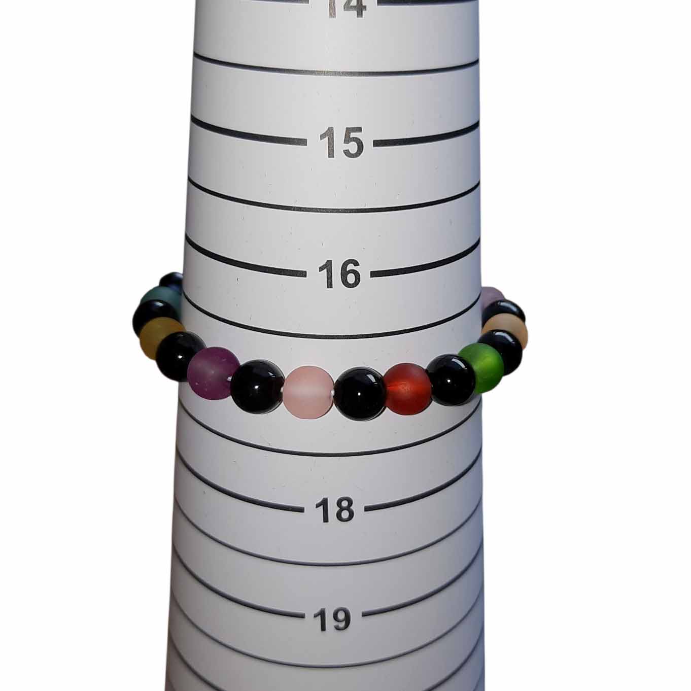 Bright coloured glass beads are offset with black agate to create a striking look. Elasticated for comfort.