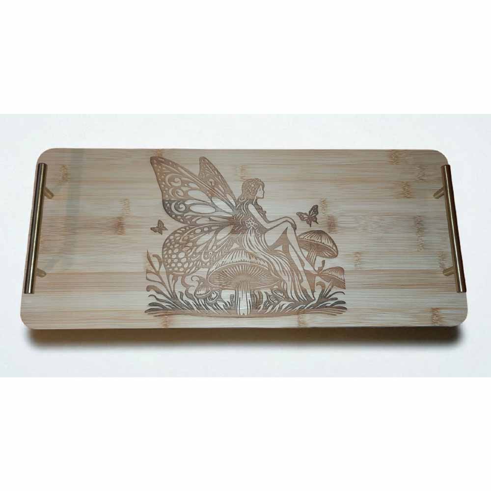 Lovely bamboo tray etched with a fairy sitting on a toadstool and finished with brass coloured metal handles.