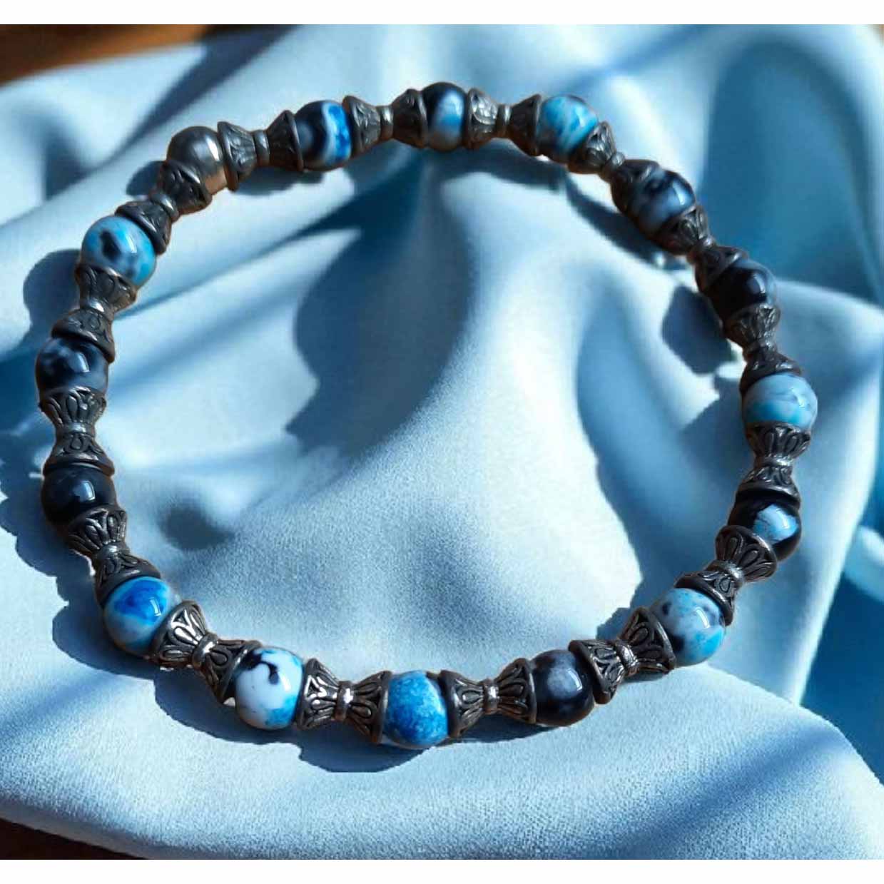 This agate bracelet with double ended, cup spacers has an antique and quite delicate look. Elasticated for comfort.
