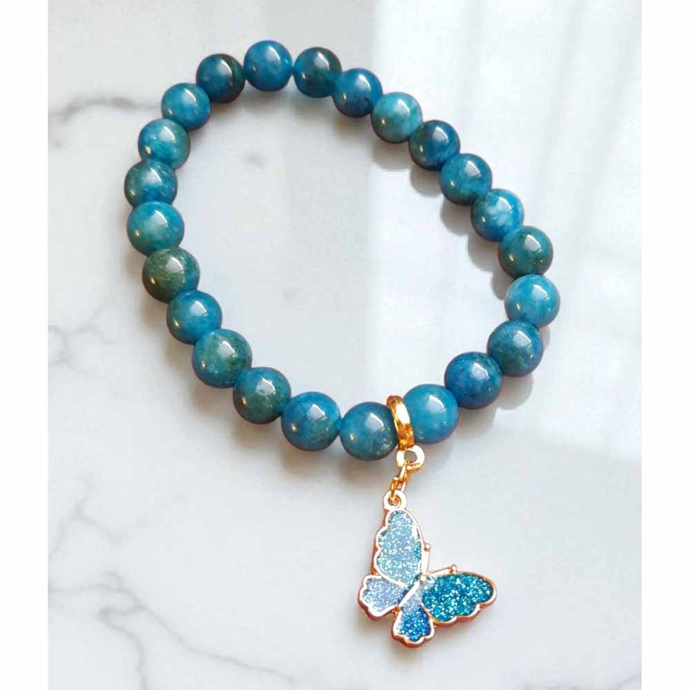 Deep blue stone beads support a sparkly blue, enamel butterfly charm.
