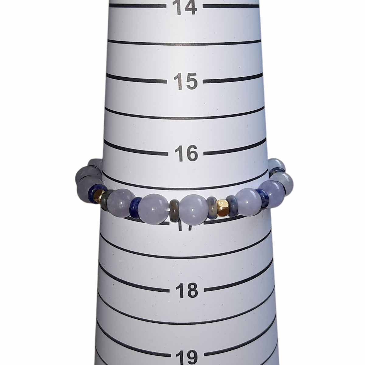 Contrasting shades of blue are offset with small, gold coloured spacers. Elasticated for comfort.