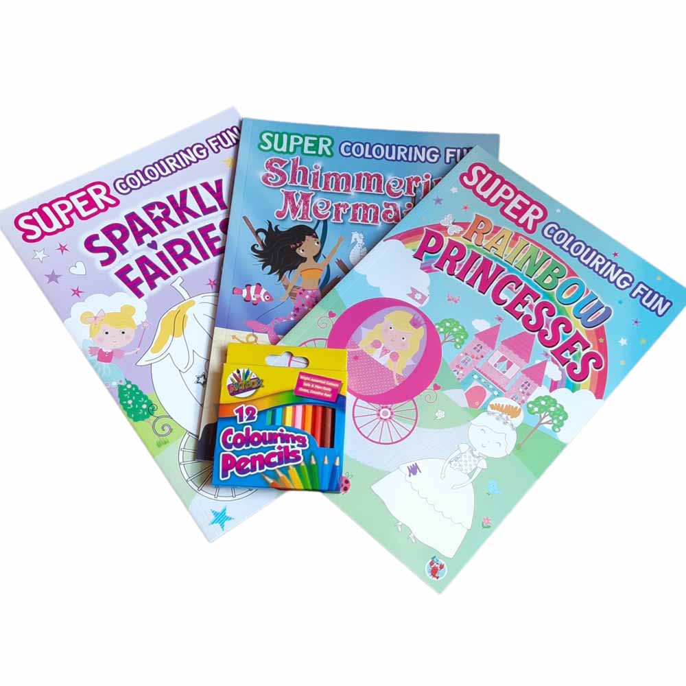 Super Colouring Fun books are full of bold images and puzzles for children to complete. Each bundles comes with a pack of half sized colouring pencils.