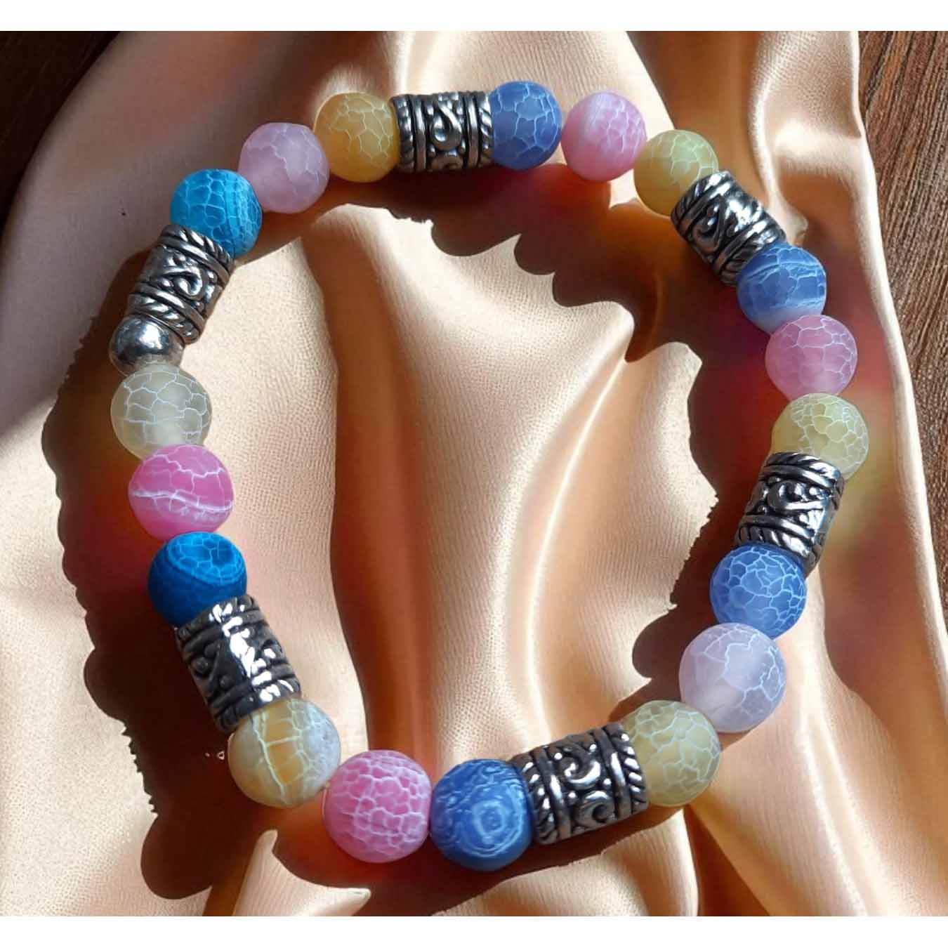 Elasticated bracelet. Cracked agates and metal tube spacers create a bold pattern that reflects the colours of the pan sexual flag.