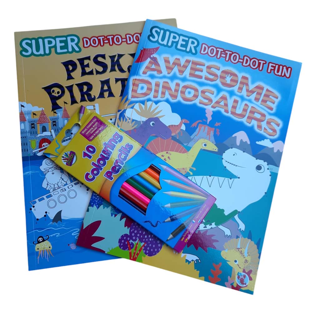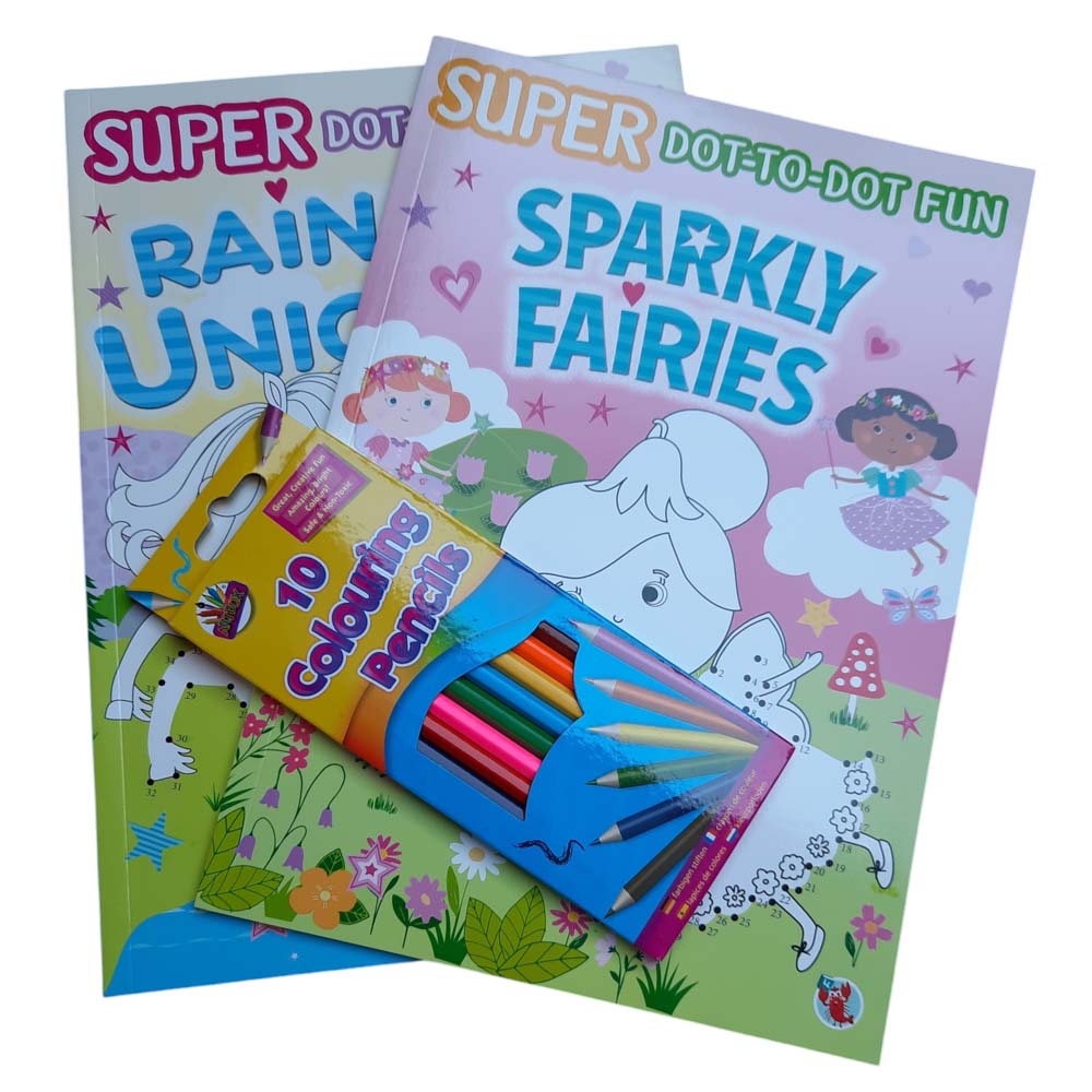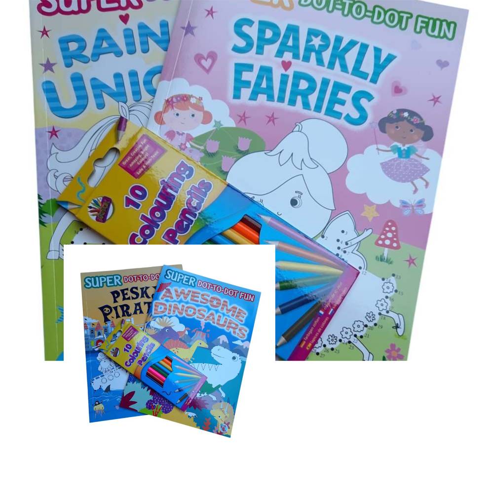 A selection of dot-to-dot images to join and colour. Each set of 2 books is accompanied by a pack of brightly coloured pencils.