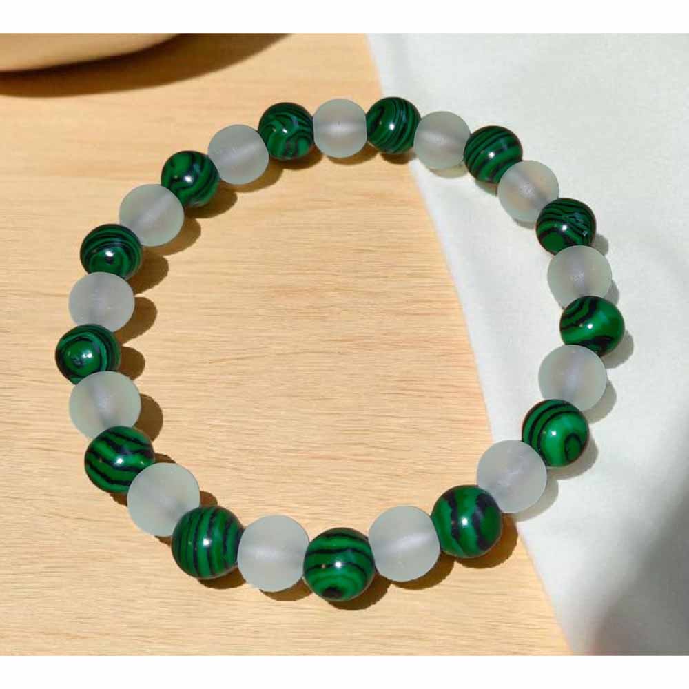 Striped malachite and frosted glass beads create a striking and unusual bracelet.