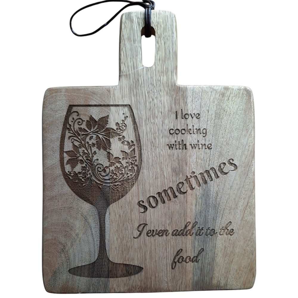 Practical, kitchen decor. This lovely, hand cut chopping board doubles as a great kitchen sign. Etched with 'I love cooking with wine. Sometimes I even add it to the food' .
