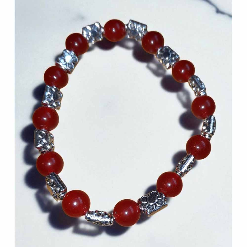 Deep red jade beads separated by silver coloured, embossed, metal spacers.