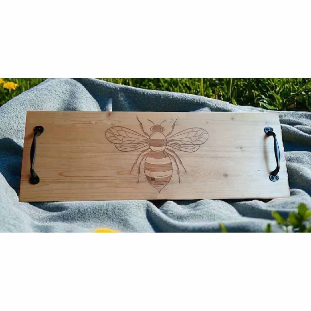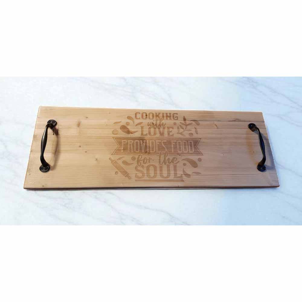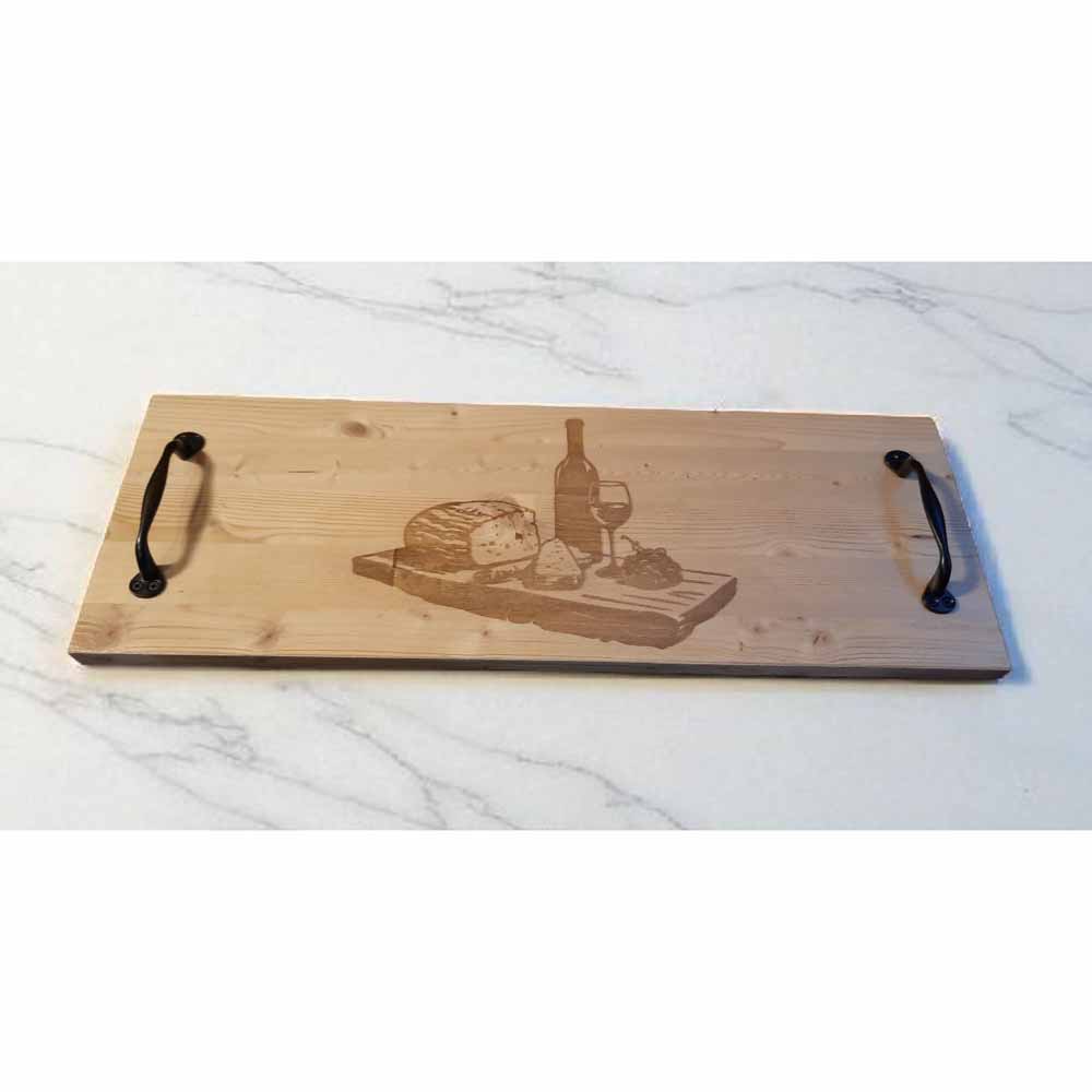 Long serving boards with black metal handles.  Each board is etched for a lasting design and is then sealed with water based, non toxic varnish.  Black polyester felt is applied to the base to protect surfaces.