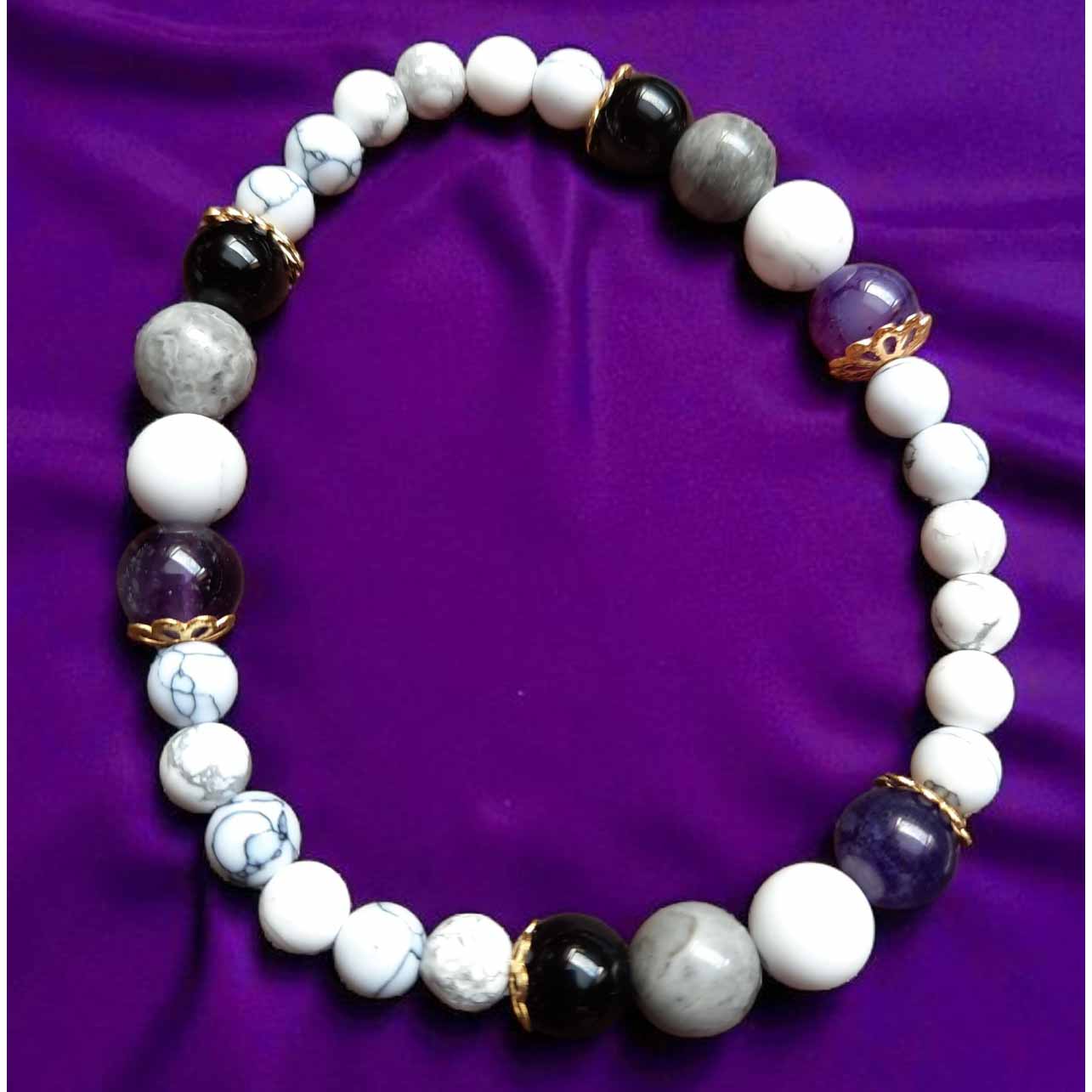 A mixed stone bracelet that represents the colours of the asexual flag. Threaded on elastic cord for comfort. The colour bands are separated with small gold coloured caps.