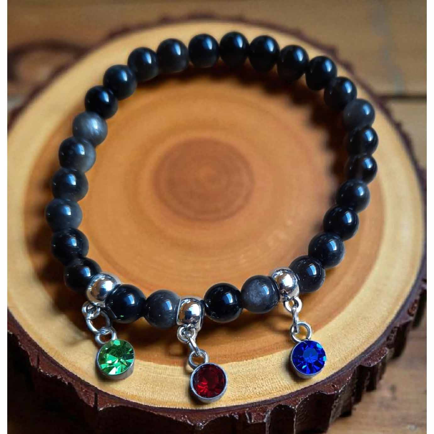 Dark obsidian beads form the background to 3 brightly coloured glass charms.