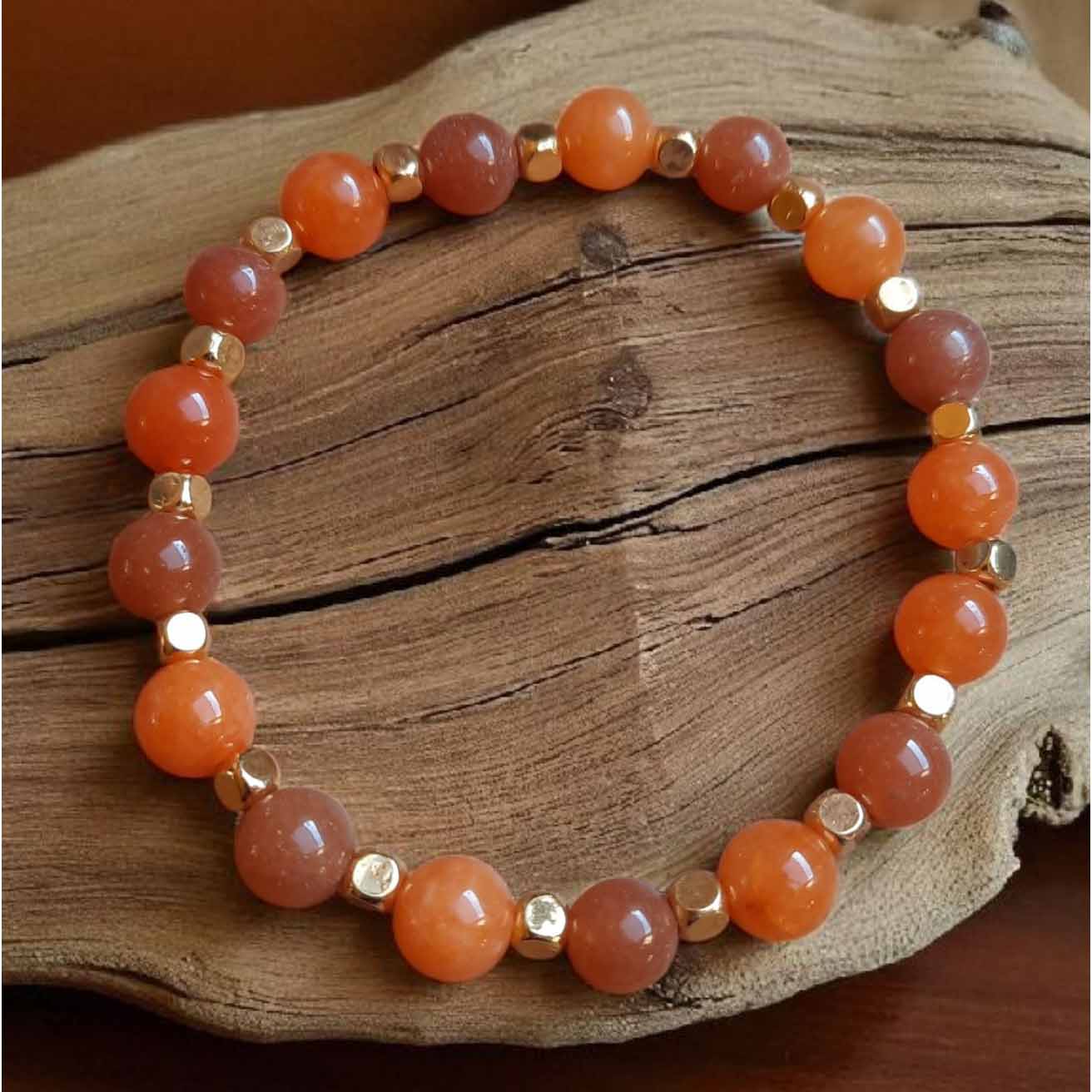 Bright coloured, beaded bracelet is made with stones and gold coloured, cubed spacers.