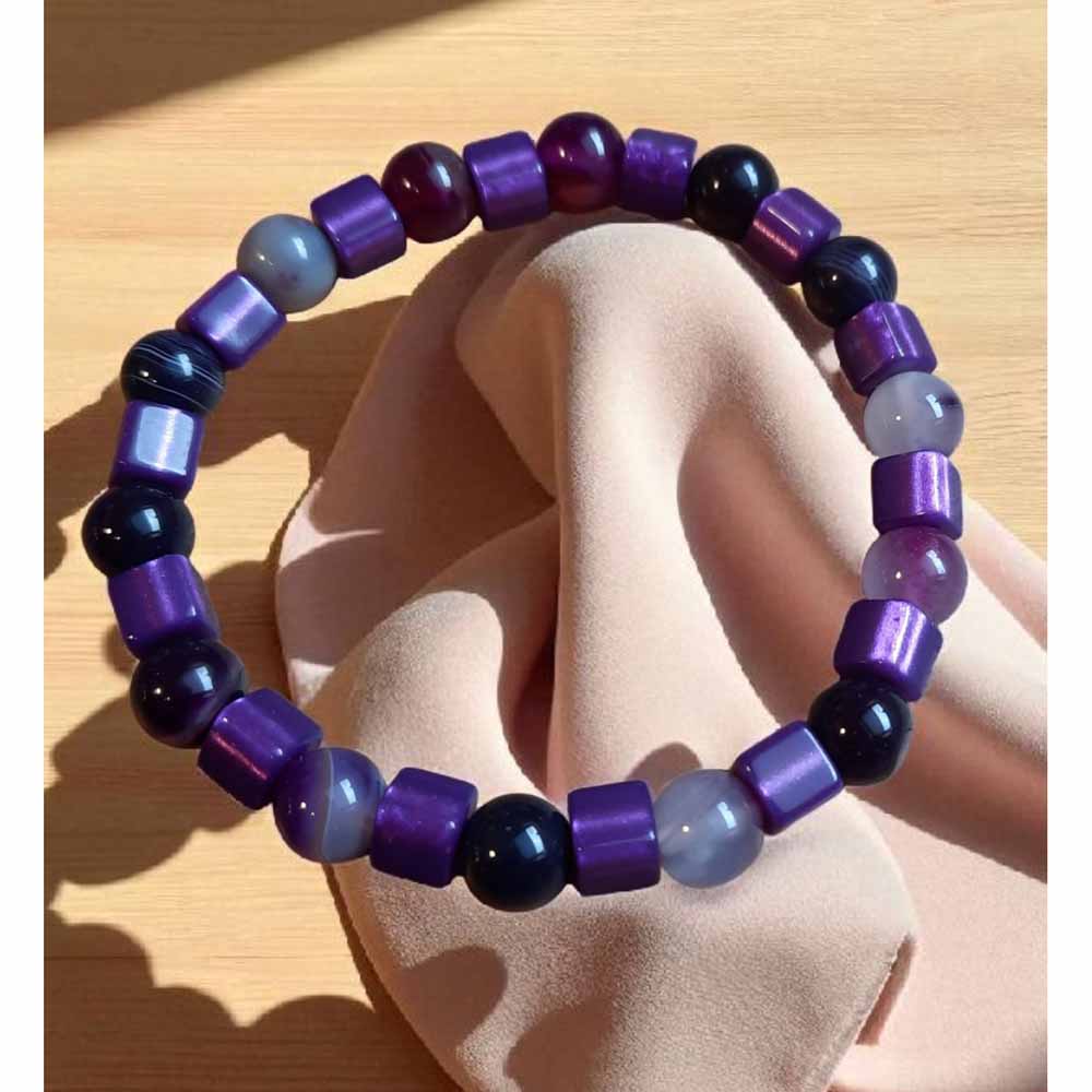 Deep purple beaded bracelet made up of agates with polyester cubed spacers.