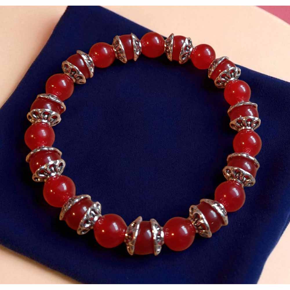 Red jade beads are offset with silver coloured metal spacers that enclose every second bead.