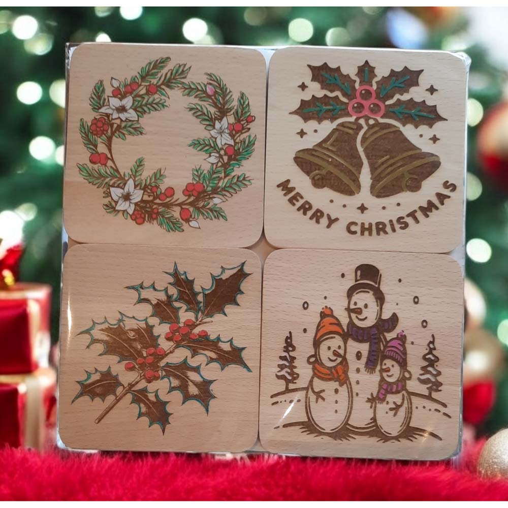A set of 4 beechwood coasters with seasonal designs.  Each coaster is etched and hand painted.