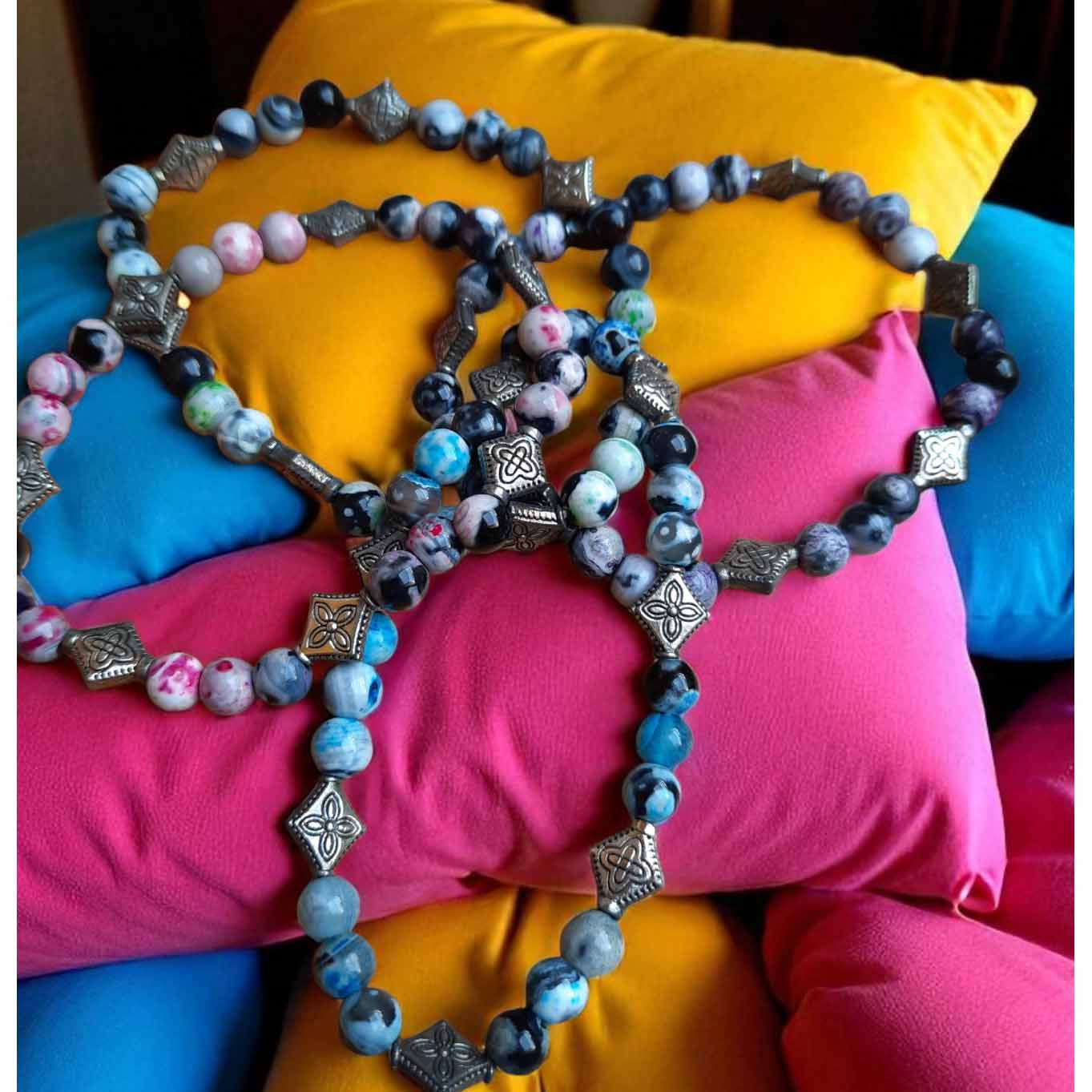 4 stacking bracelets made with small beads and diamond shaped spacers. Each bracelet is a different colour; pink, blue, green, purple.