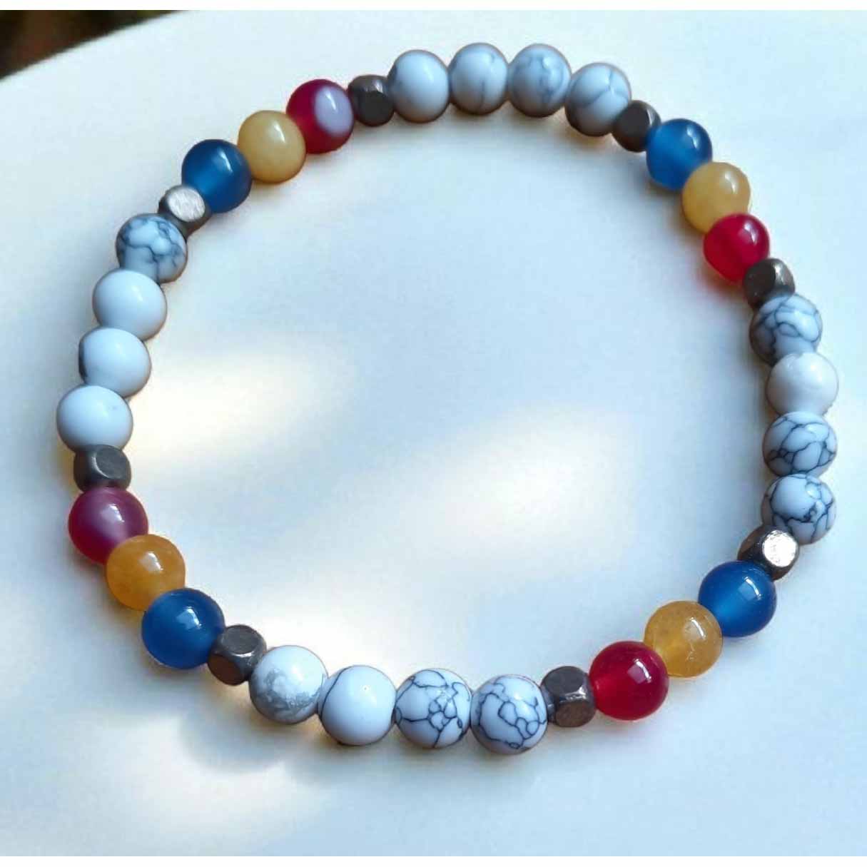 3 agates in the pan sexual colours are separated by magnesite beads and small, cube spacers. Elasticated for comfort.