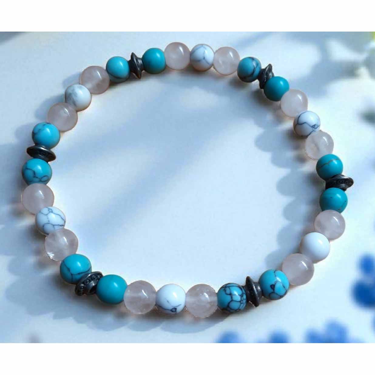 Small stone beads are combined with metal, disc shaped spacers to reflect the trans flag colours. Elasticated for comfort.