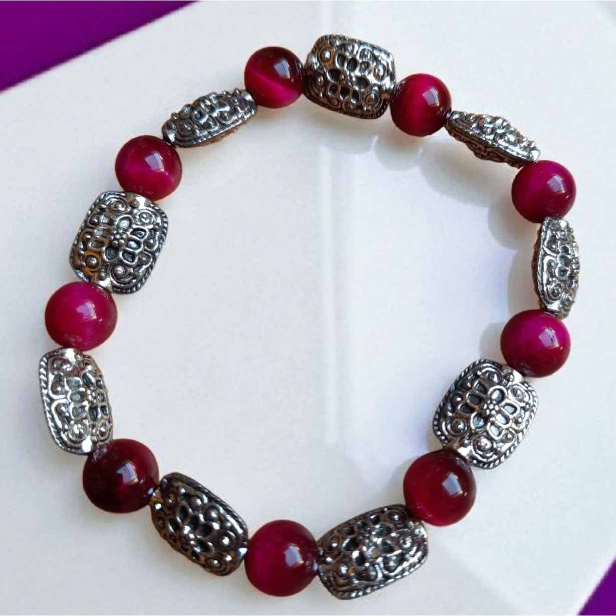 The bold fuchsia pink is offset with silver coloured metal spacer beads to create a real statement piece of jewellery. Elasticated for comfort.